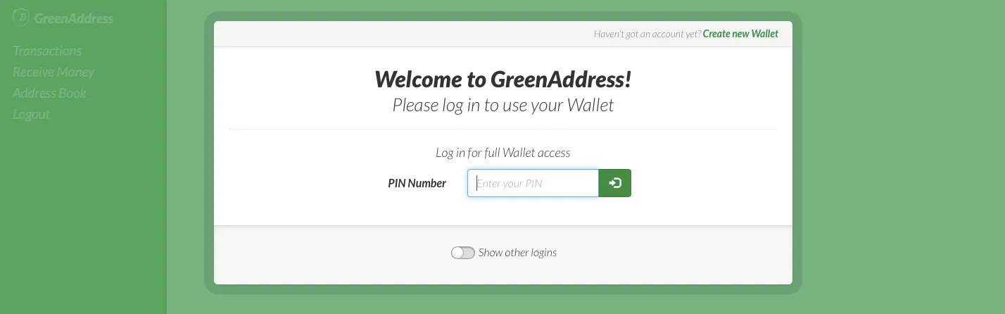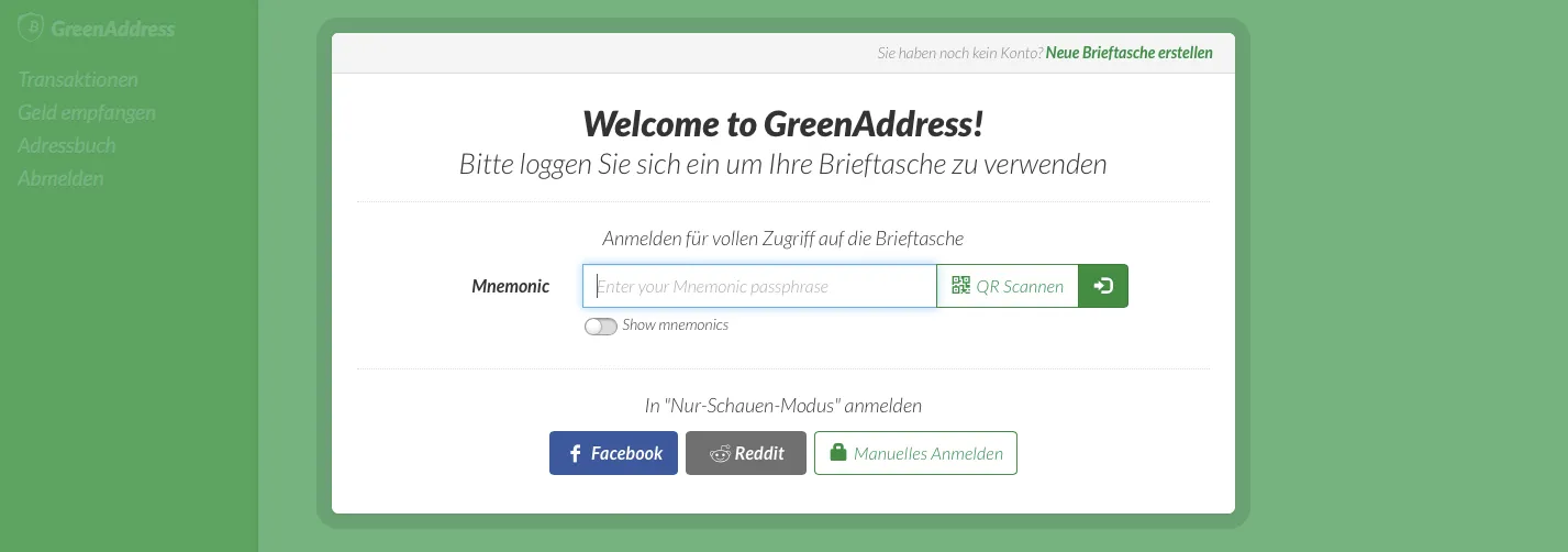 Um nur schnell mal nach deinem Kontostand, oder erhalten Zahlungen zu schauen, kannst du den “Nur-Schauen-Modus“ nutzen um dich Anzumelden. Geh dazu auf https://greenaddress.it/de/wallet.html und klick unten auf Manuelles Anmelden, oder Facebook/Reddit Login.