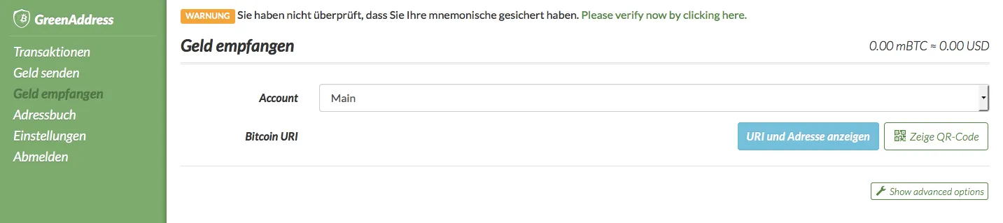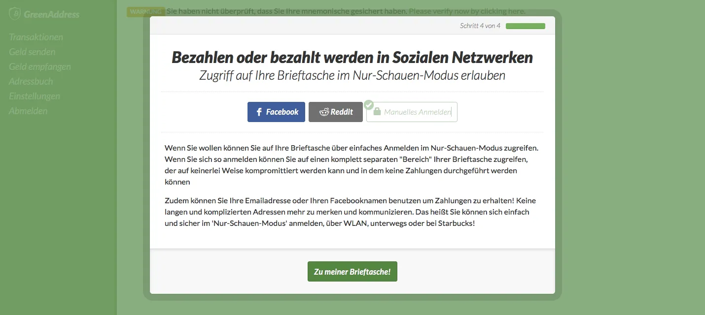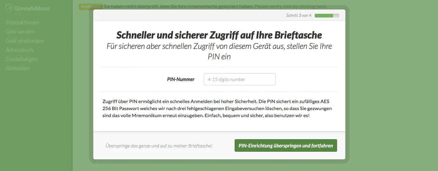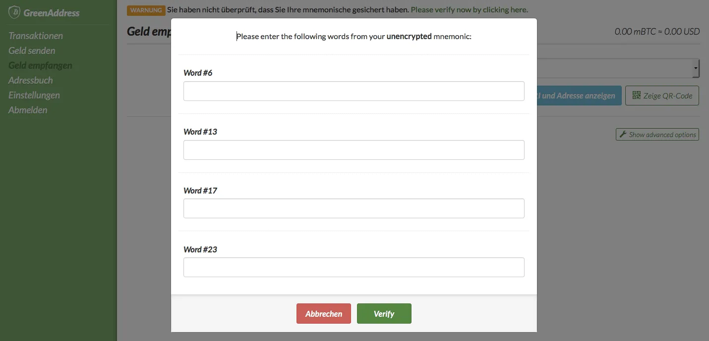 Du hast jetzt deine Wallet/Brieftasche auf greenaddress.it eingerichtet. Es erscheint jetzt noch eine Warnmeldung in der du aufgefordert wirst deine abgespeicherte mnemonics zu bestätigen. Klick oben auf
