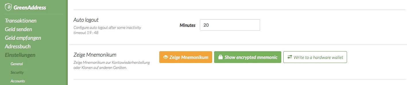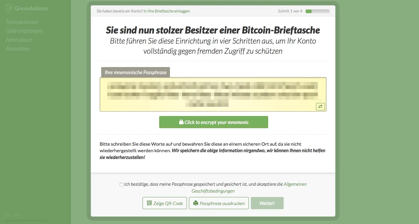 Was ist die mnemonic passphrase? Die mnemonic passphrase ist eine Art Wiederherstellungsschlüssel für deine Wallet. Drucke sie aus, oder speichere sie an einem sicheren Ort, wie zum Beispiel 1Password ab. Denn wenn du deine Zugangsdaten zu greenaddress.it und deine mnemonic passphrase vergisst ist deine Wallet mit all deinen Bitcoins weg.non-encrypted mnemonics: 24 Wörter, kann benutzt werden um sich bei greenaddress.it anzumelden encrypted mnemonics: 27 Wörter mit BIP38/scrypt Verschlüsselung, kann mit dem zusätzlichen Passwort verwendet werden um sich anzumelden