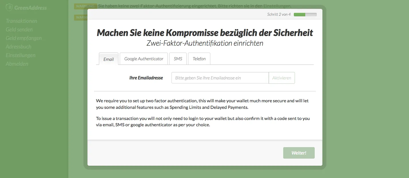 Um die Sicherheit deiner Wallet zu erhöhen, verwendet greenaddress.it eine Two-Factor Authentication (Zwei-Faktor-Authentifizierung). Wenn du eine Transaktion machen willst, musst du ein zusätzliches Passwort eingeben, das du per Email, SMS, Telefon, oder Google Authenticator erhältst. Wähle eine der Optionen aus, befolge die Schritte und klick dann auf weiter.