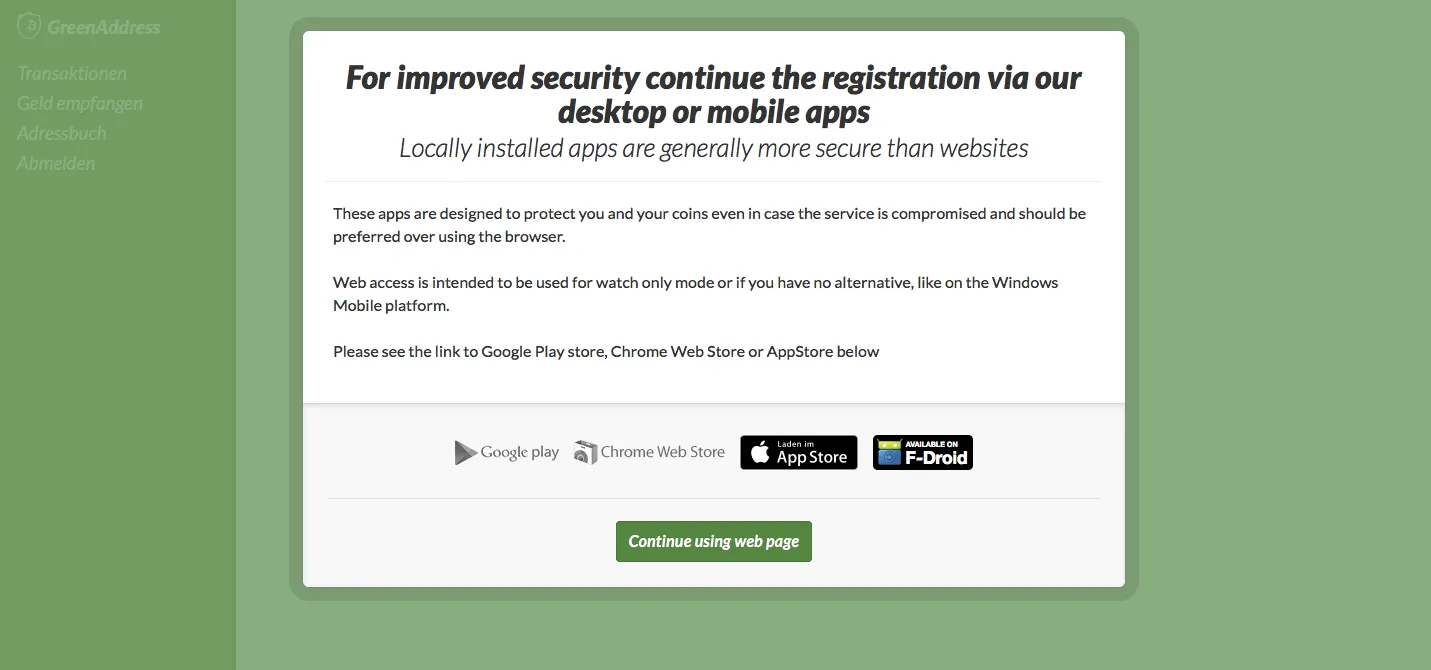 Auf der nächsten Seite werden wir darauf hingewiesen, dass es sicherer ist die Desktop oder Mobile Apps für die Registrierung zu verwenden. Ich zeige hier die Registrierung über die Webseite, da ich nicht für jede App eine Anleitung machen kann. Klick auf „Continue using web page” Hier die Links zu den Apps für Desktop (Chrome Web Store), iPhone/iPad (App Store), Android (Google play) und Android (F-Droid).