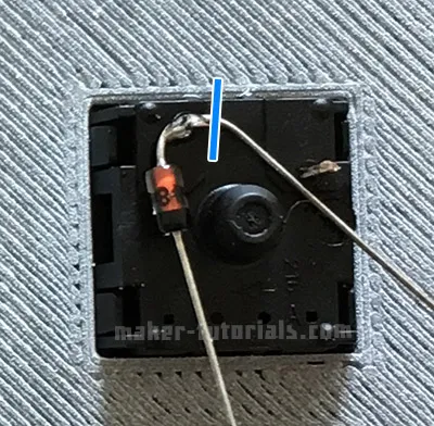 Löte an jeden Taster eine Diode an den oberen linken Pin (achte auf die Richtung der schwarzen Markierung an den Dioden). Nachdem du alle Dioden angelötet hast, entferne den überstehenden Draht an der blauen Markierung.Biege den Diodendraht wie auf dem Bild zu Zeilen und löte die Dioden in jeweils einer Reihe zusammen. In der Reihe 3 und 4 (Reihennummer beginnt bei 0) benötigst du ein Zwischenstück aus Draht.