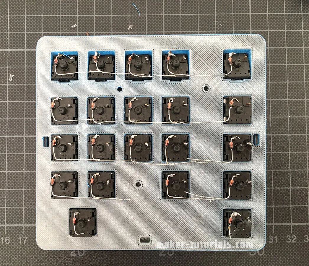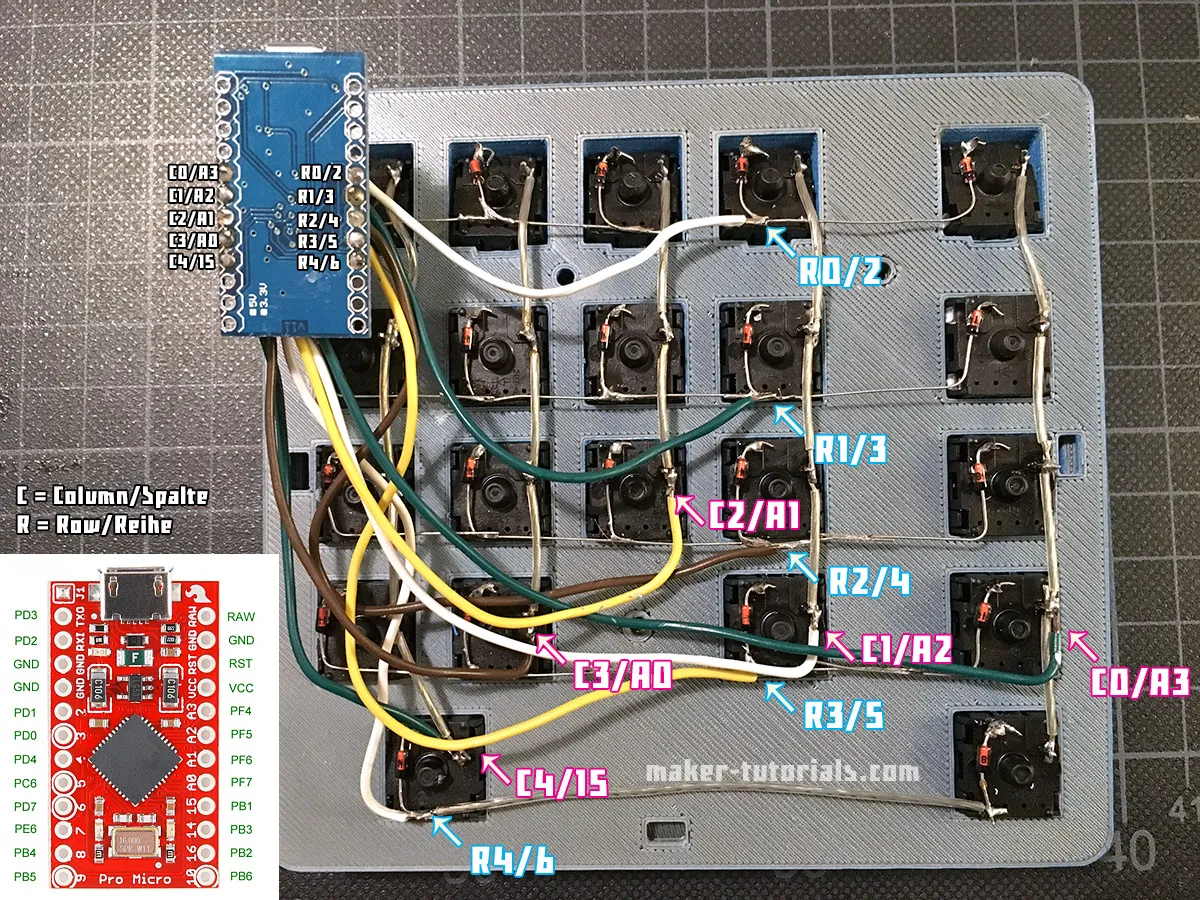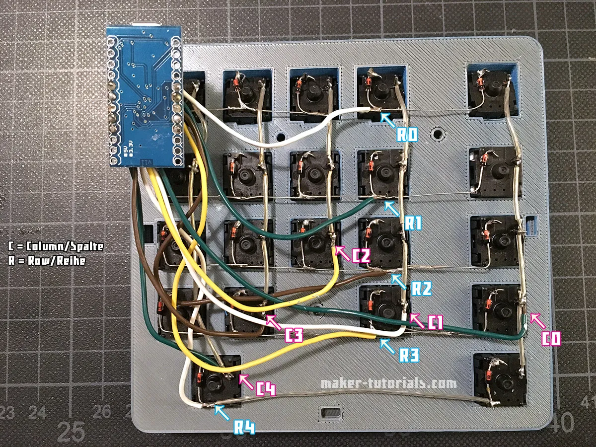 An jede Zeile und Spalte musst du ein Kabel anlöten, welche später mit den Eingängen des Arduino Pro Micro verbunden werden. Auf dem Bild habe ich dir markiert, wo ich die Kabel angelötet habe. Wenn du verstanden hast wie die Reihen und Spalten funktionieren, kannst du die Kabel auch an einer anderen Stelle anlöten. Tipp: Verwende am besten farbige Kabel, um sie besser unterscheiden zu können.
