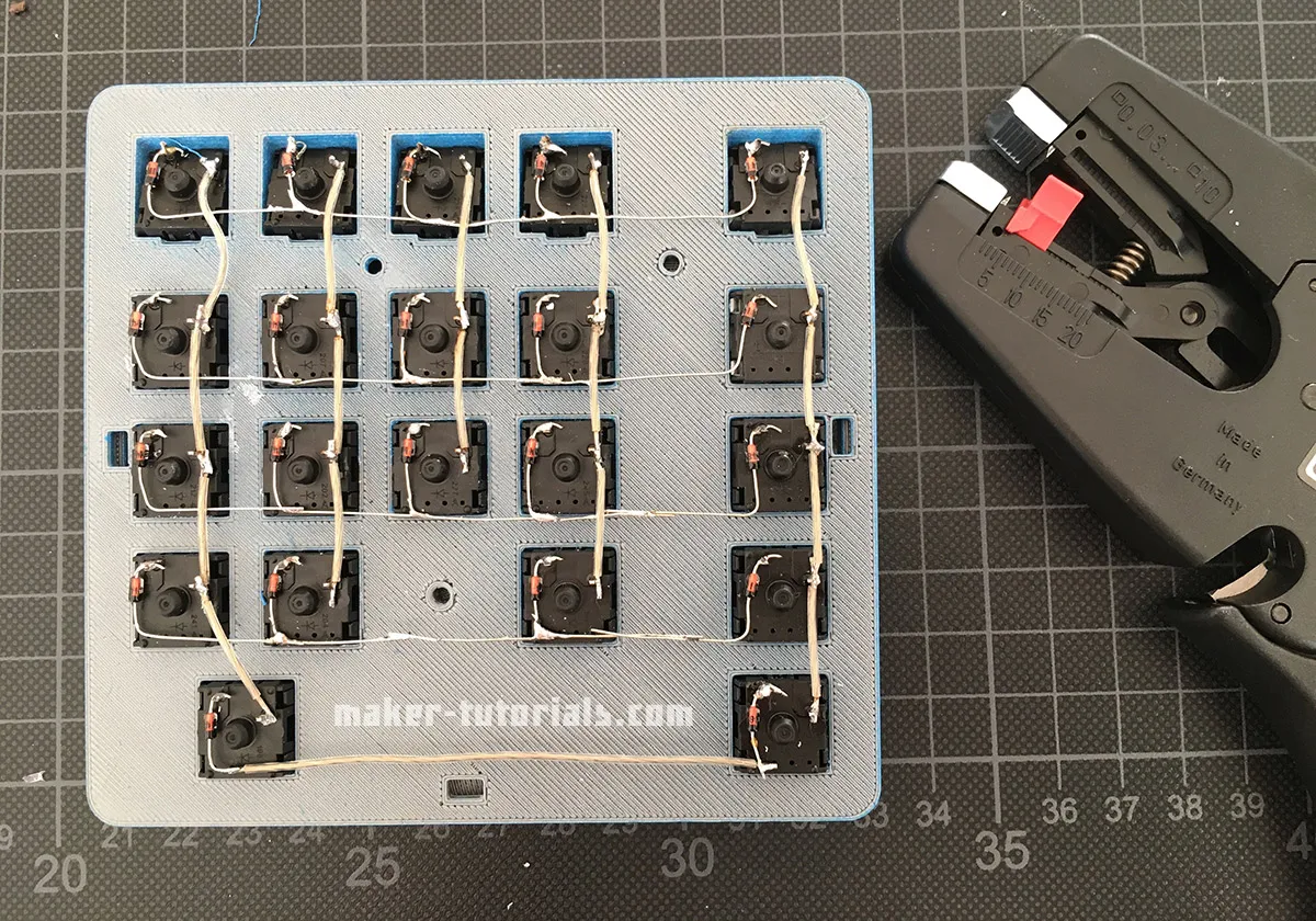 Löte die Taster jetzt in Spalten zusammen. Verbinde dazu den rechten Pin am Taster mit dem rechten Pin am Taster darunter. Dazu benötigst du ca. 2cm lange Kabelstücke wie auf dem Bild. Die Enden kannst du mit einem scharfen Messer abisolieren. Tipp: Wer öfters Lötet, dem kann ich nur die Abisolierzange von Knipex empfehlen. Sie ist zwar teuer, aber funktioniert sehr gut im Gegensatz zu billigen Abisolierzangen.