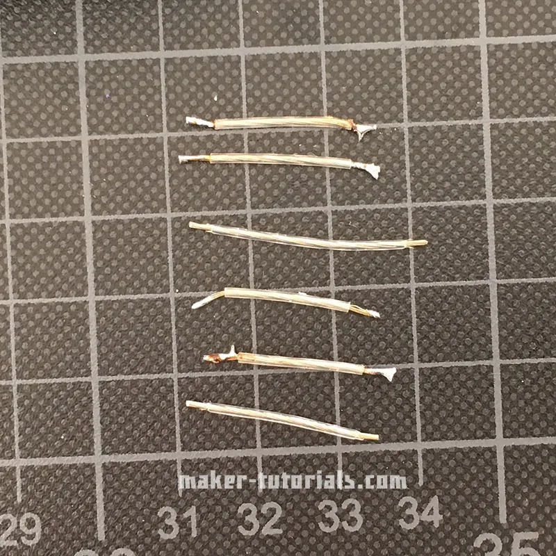 Um das Anlöten der Dioden zu vereinfachen, solltest du die Dioden zurechtbiegen. Lass die Dioden in der Papierhalterung und biege sie an einer Tischkante wie auf dem Foto (achte auf die Richtung der schwarzen Markierung an den Dioden).